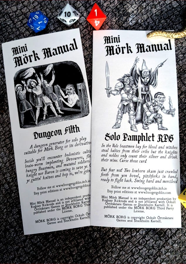 Mini Mörk is a rework of Mörk Borg with a twist: it’s a solo one-page RPG, plus another page for the Dungeon-Crawling rules.