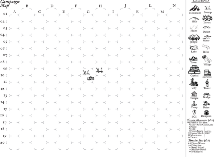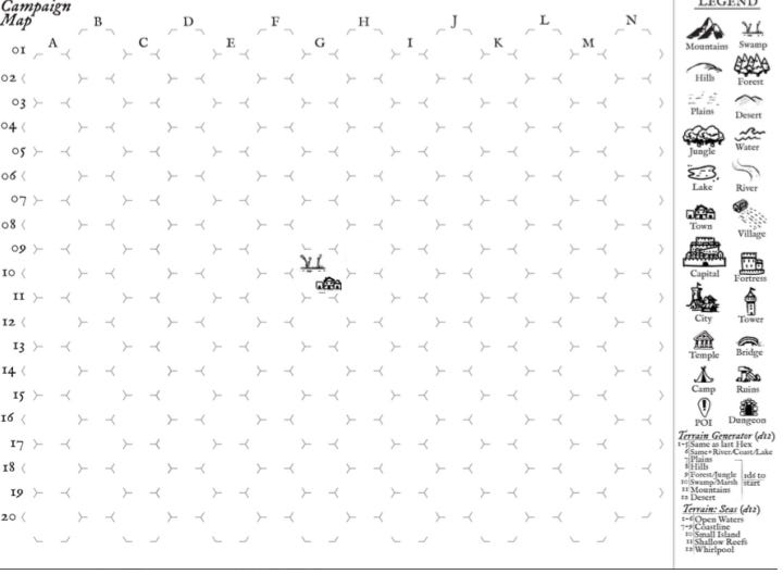 I choose to start on the center of the map, in a village, then roll to see the terrain type on the Solo Toolkit’s Hex rules.