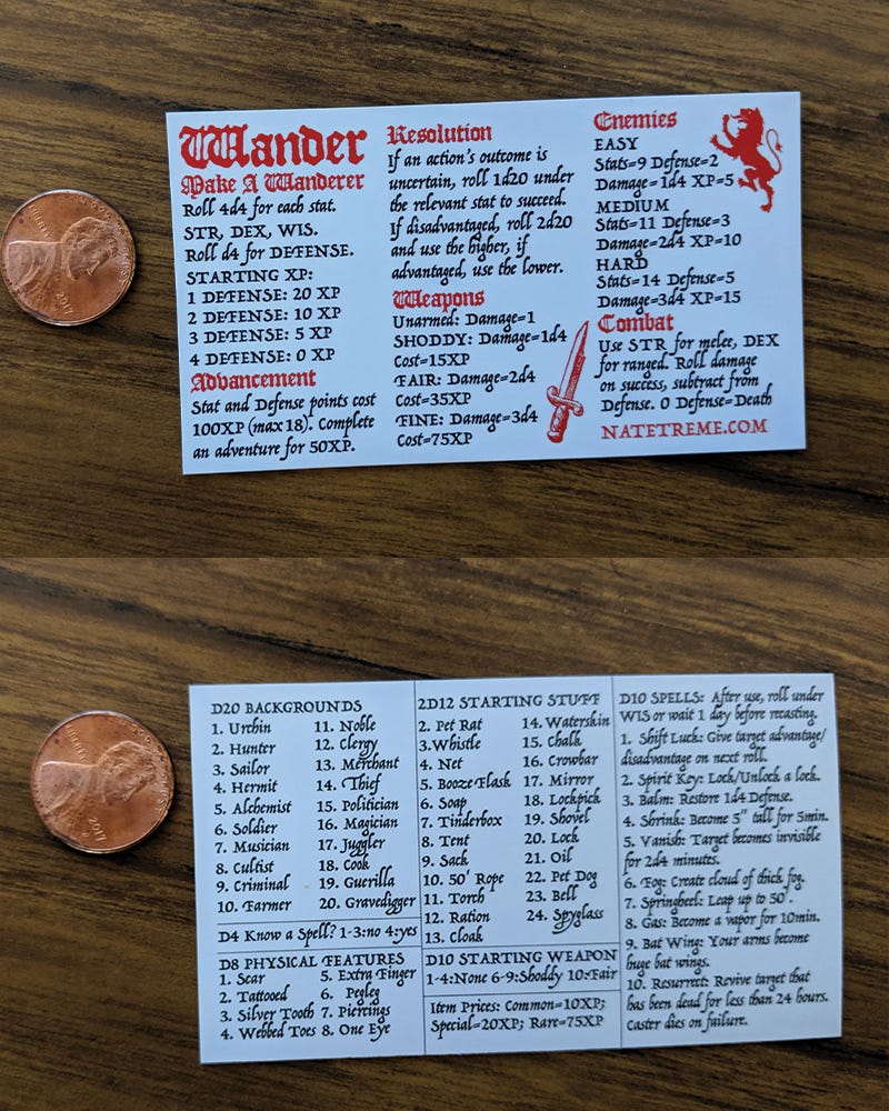 I play solo for some times now and I wanted to try things with simple mechanics and small format, like pocketmods and business cards.