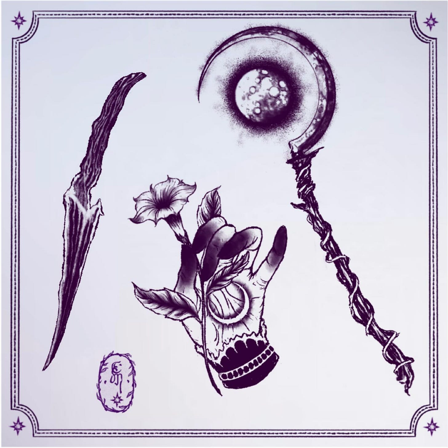 She’s called Enfant De Minuit (Moonlight Child in Mr Beast’s language) and makes amazing folk/witchy/moody tattoos. Her inspirations are various: Fantasy, Dark art, Horror and weird Folk stuff.
